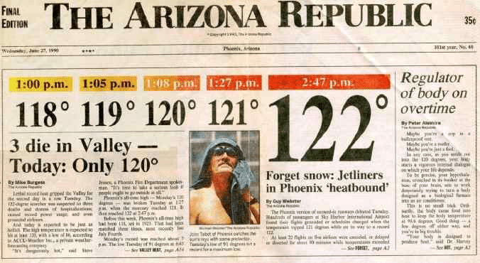 While 117 degrees is sweltering, it’s not the highest temperature Arizona has ever recorded. On June 26, 1990, Phoenix hit a record of 122 degrees Fahrenheit (50 degrees Celsius). The heat was so intense that air conditioning units failed, hospitals were overwhelmed with cases of heatstroke, and even some flights were grounded because the runways were too hot. This historical record highlights just how severe Arizona’s heatwaves can be and the profound impact they have on daily life.