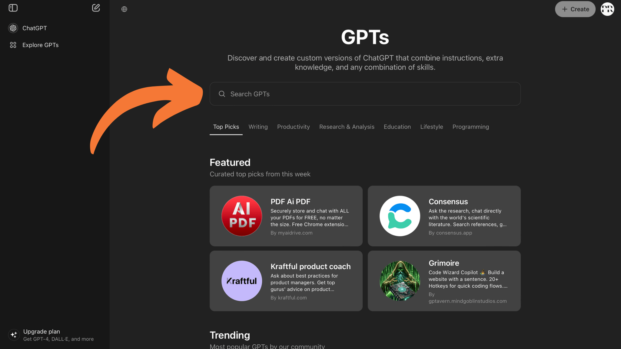 - Explore the GPT Marketplace: On the main dashboard, look for an option like “Explore GPTs” or “Marketplace.” Click on this to access a range of specialized GPTs.